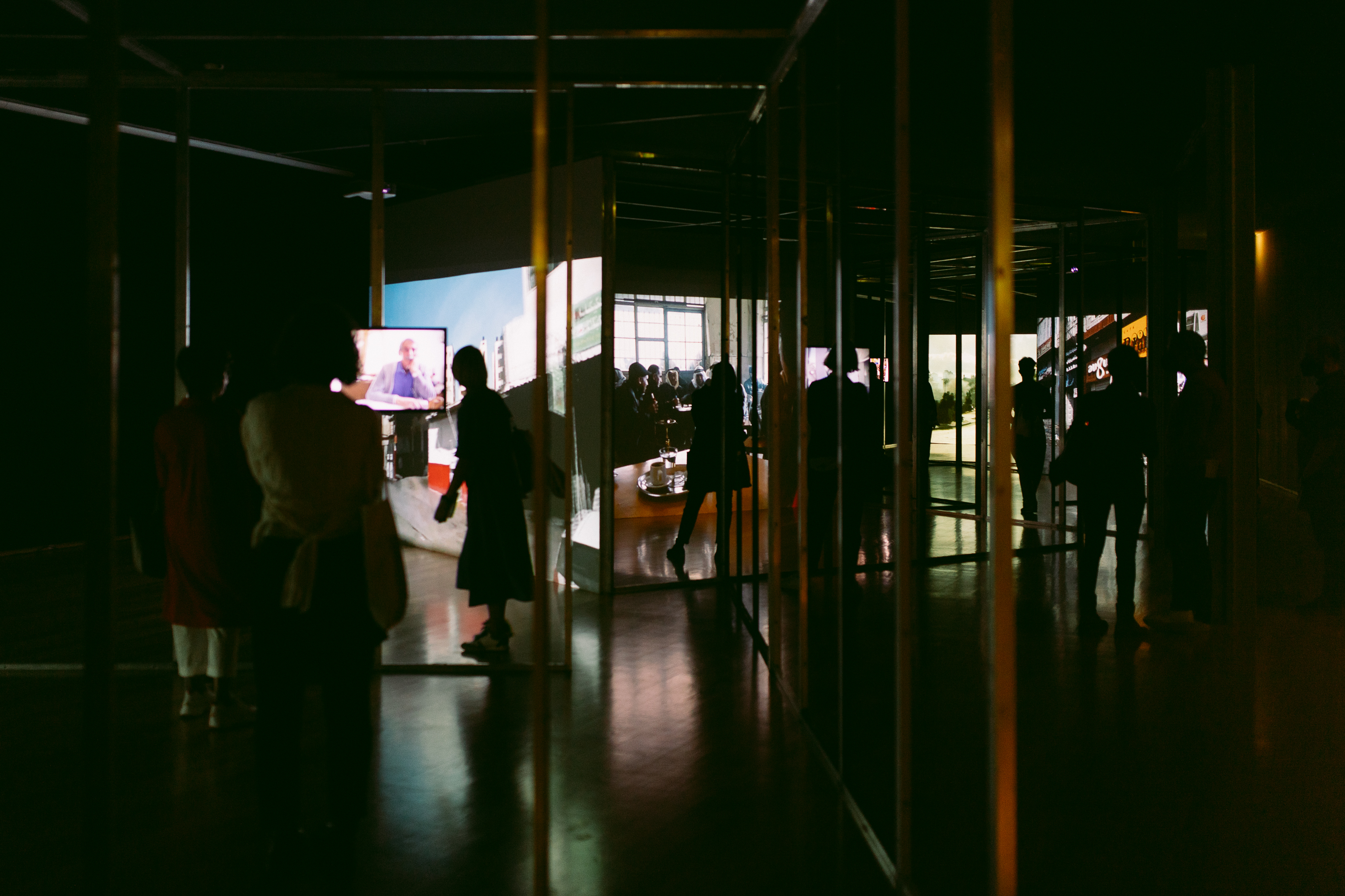 The idea was about reusing an existing metal structure to compose a transparent and trespassable structure to hold the mediums Projector-screens and LED-screens for the interviews and the visual landscape. The structure used for the exhibition was designed by Diogo Aguiar Studio.