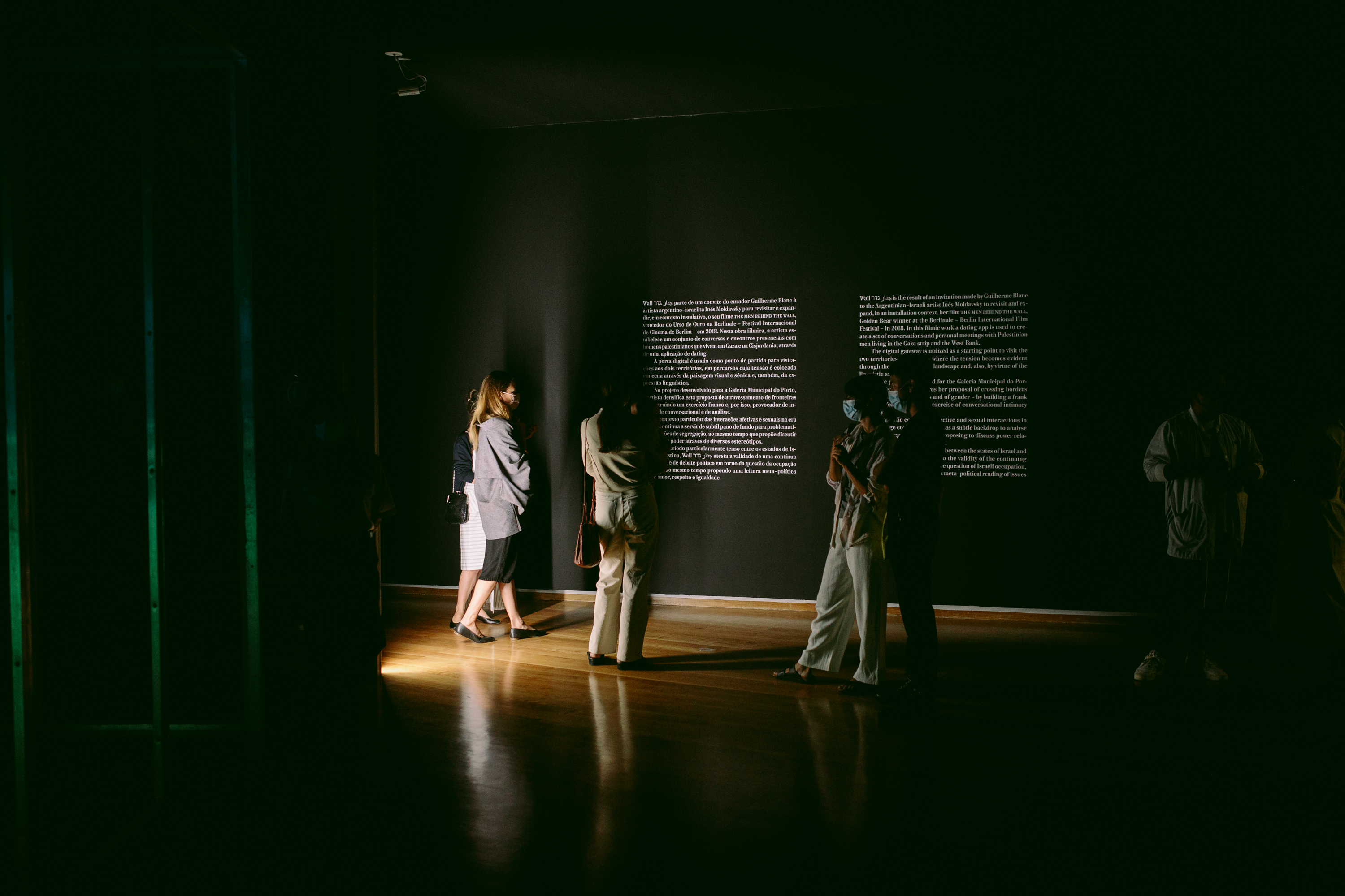 Wall גדר جدار is the result of an invitation made to the Argentinian-Israeli artist Inés Moldavsky to revisit and expand, in an installation context, her film The Men Behind the Wall, Golden Bear winner at the Berlinale – Berlin International Film Festival – in 2018. In this filmic work a dating app is used to create a set of conversations and personal meetings with Palestinian men living in the Gaza strip and the West Bank. The digital gateway is utilized as a starting point to visit the two territories, in journeys where the tension becomes evident through the visual and sonic landscape and, also, by virtue of the linguistic expression. In the project developed for the Galeria Municipal do Porto, the artist further explores her proposal of crossing borders – digital, political, religious and of gender – by building a frank and, therefore, provocative exercise of conversational intimacy and analysis.The specific context of affective and sexual interactions in the digital age continues to serve as a subtle backdrop to analyse questions of segregation, while proposing to discuss power relations through various stereotypes.In a particularly tense period between the states of Israel and Palestine, Wall גדר جدار attests to the validity of the continuing need for political debate about the question of Israeli occupation, while simultaneously proposing a meta-political reading of issues of love, respect and equality.
