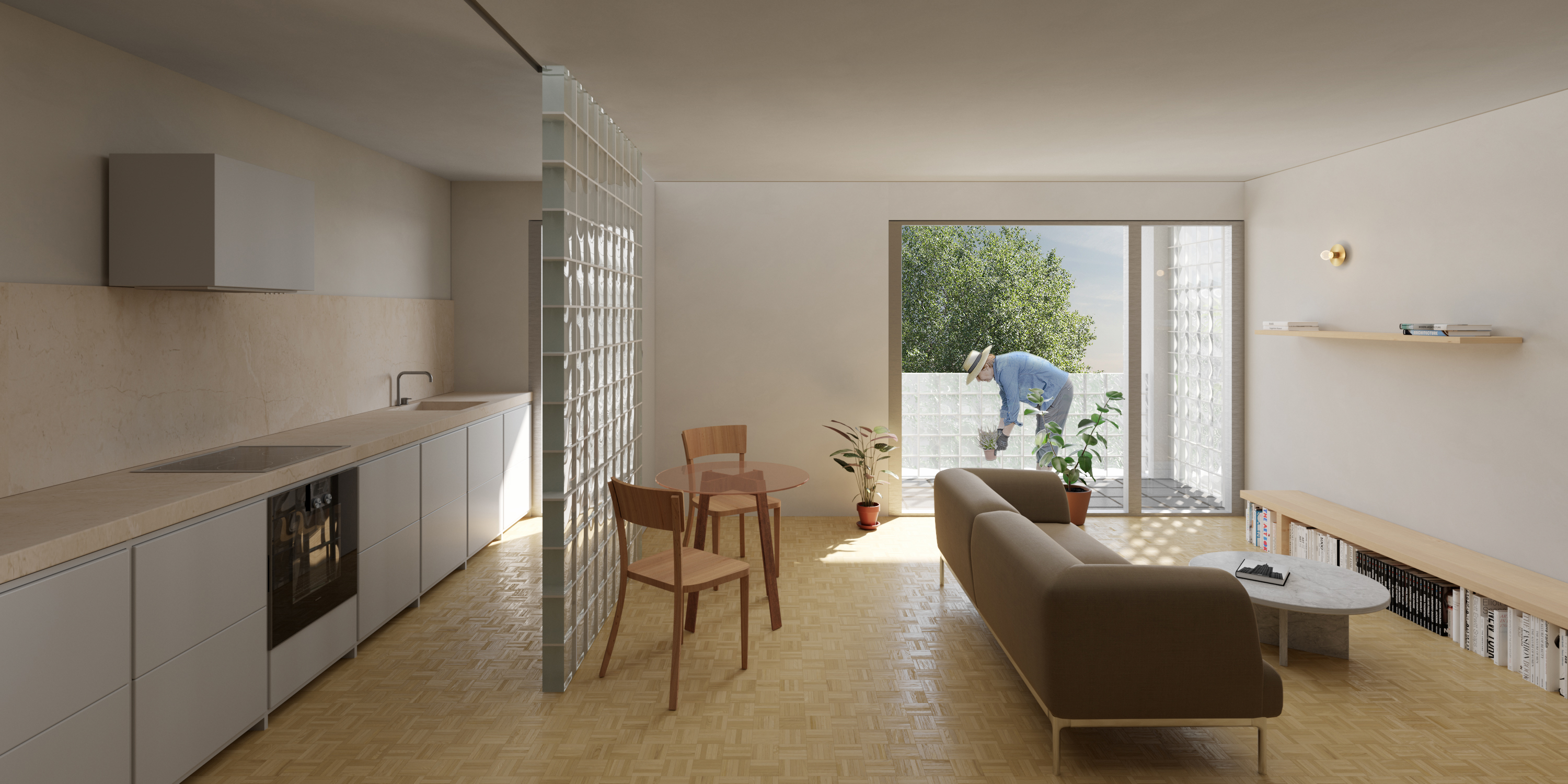 The aim was to provide all houses with a private outdoor area, addressing an architectural design need that became more evident during the lockdown caused by the Covid-19 virus. During this period, the feeling of seclusion emphasised the need to include outdoor spaces in architectural projects; although this is a pre-existing need, it must be rethought, allowing the exploration of new solutions that ensure more comfort. Thus, the incorporation of visually continuous balconies is a basic principle in the elaboration of this project, related to the architectural quality that this design provides, by allowing and encouraging the contemplation of the surrounding landscape and the integration of nature in the building.