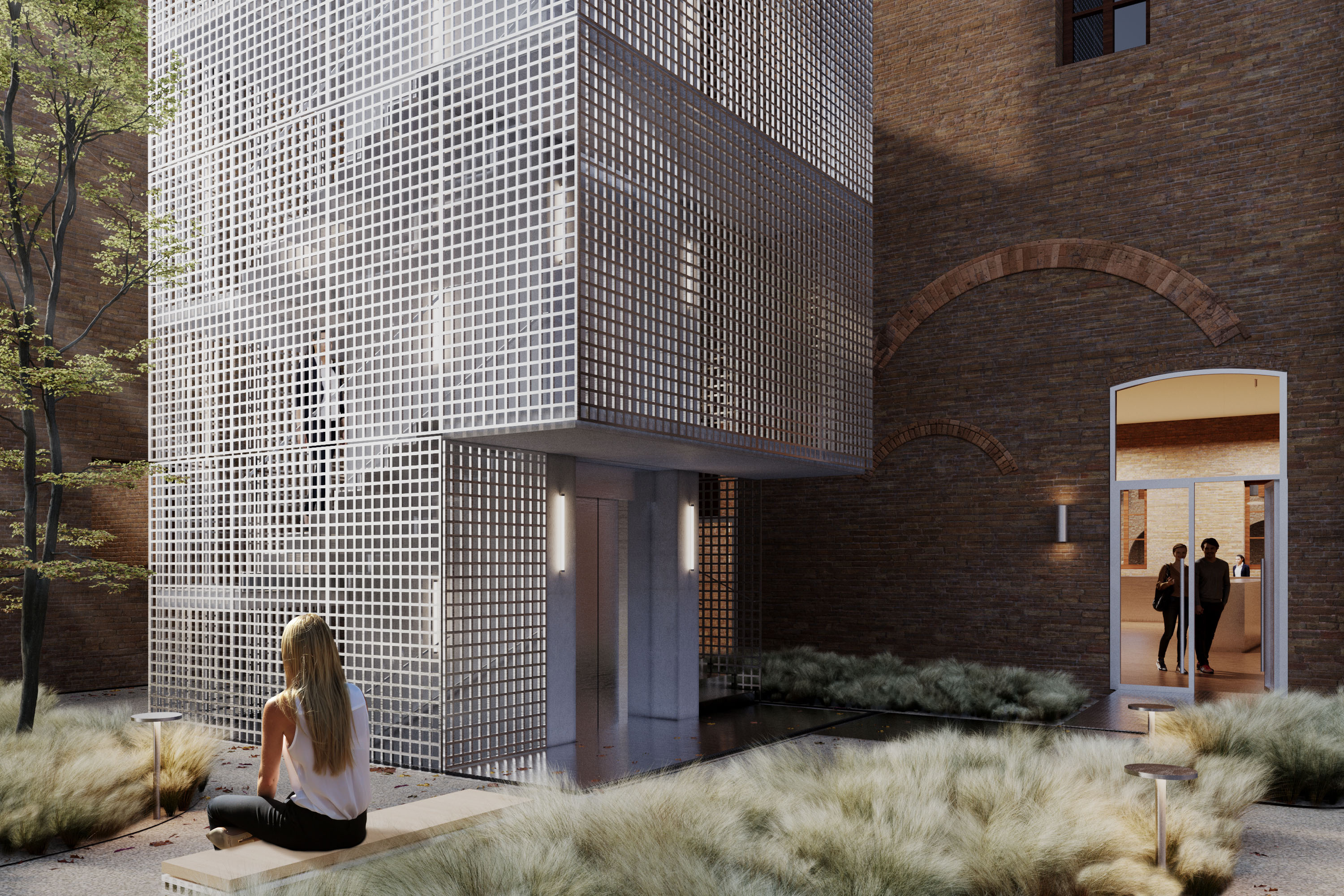 Accessible to all, the space-efficient courtyard design adheres to legal requirements, minimizing the footprint within the densely built area. Compliant with fire safety regulations, the structure aligns with the BBPR-designed monument's orthogonal layout, seamlessly blending into the historical site through reflective materials.